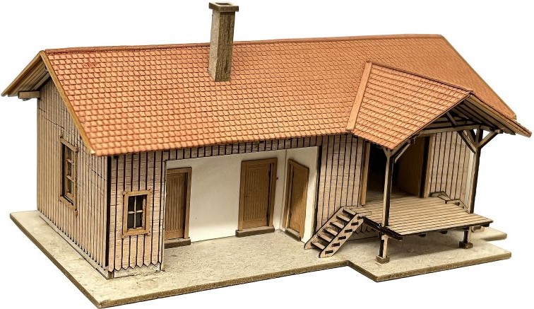 Lieferumfang: Kompletter Bausatz zum Bau eines Haltepunkt- / Bahnhofsgebäudes, bestehend aus dem Grundgerüst mit Innenwänden (Graupappe), Holzverkleidung, Dachbindern aus Holz, mehrschichtigen Fenstern mit Verglasung, Innenwänden und Holzboden.