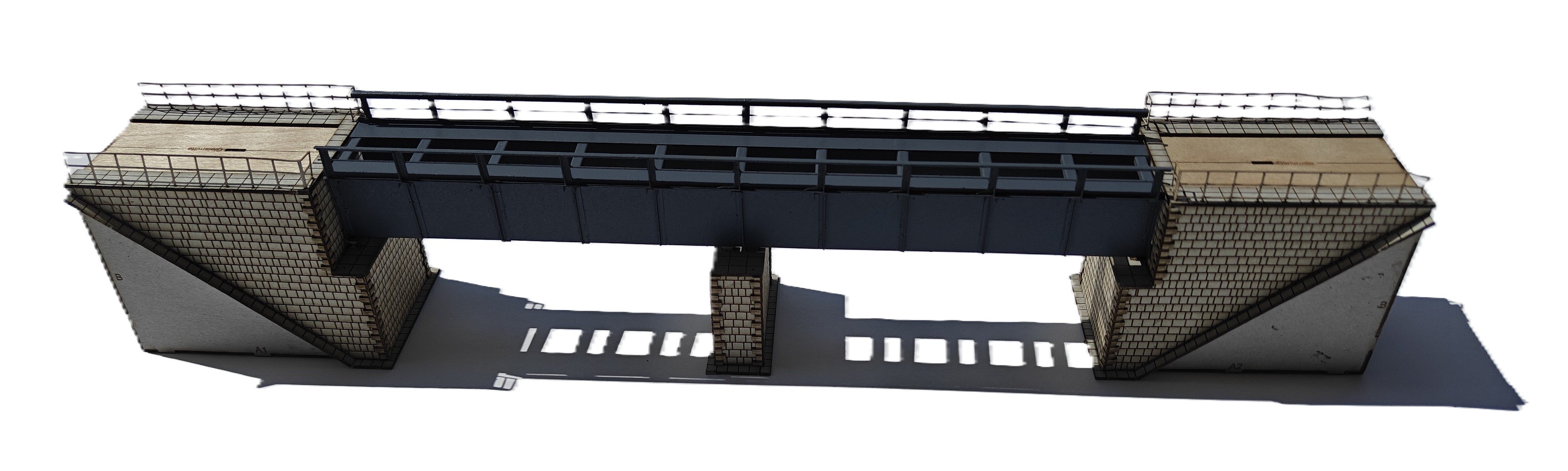 Die Brückenköpfe sind aus gravierter Graupappe und haben eine hölzerne Mittelstützwand und Deckplatte, um Schäden durch Feuchtigkeit (Leim) beim Schottern zu vermeiden. Der Bahndamm wird bei dieser Variant am Brückenkopf abgeböscht.