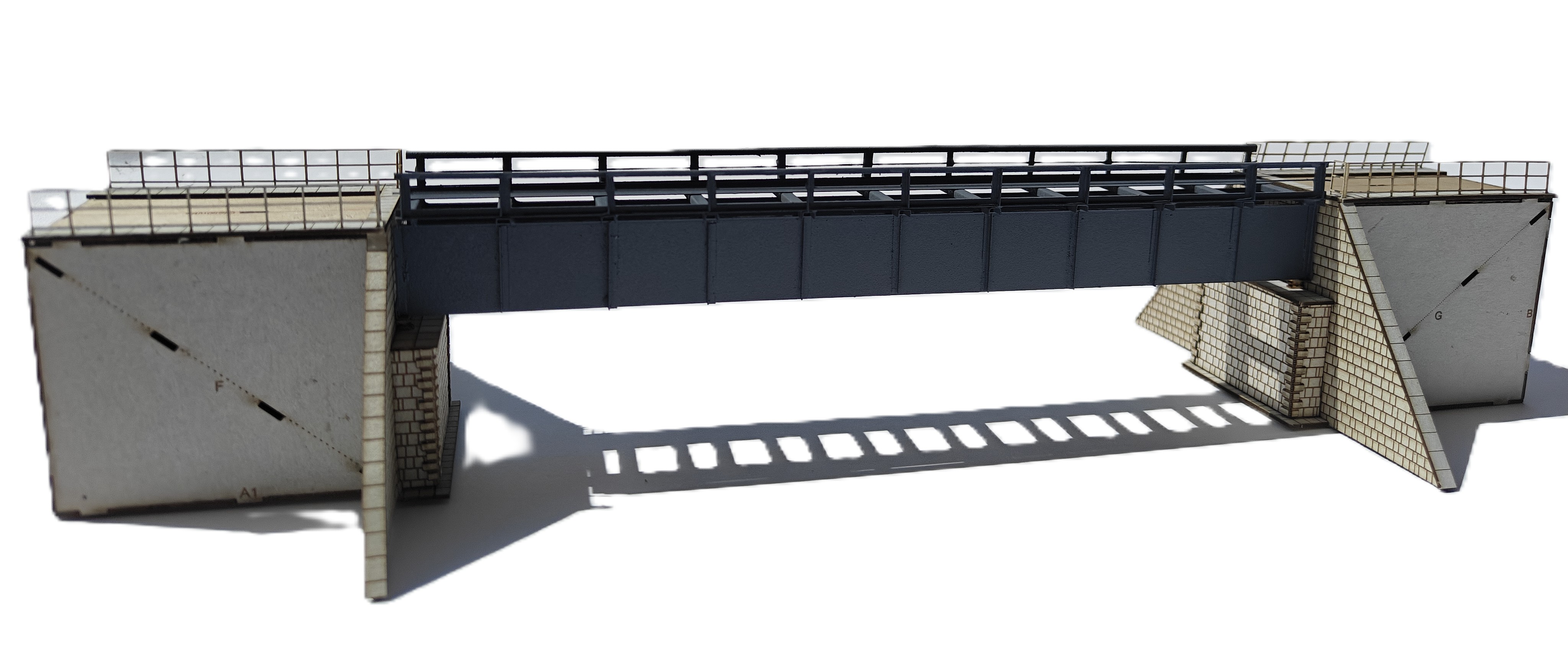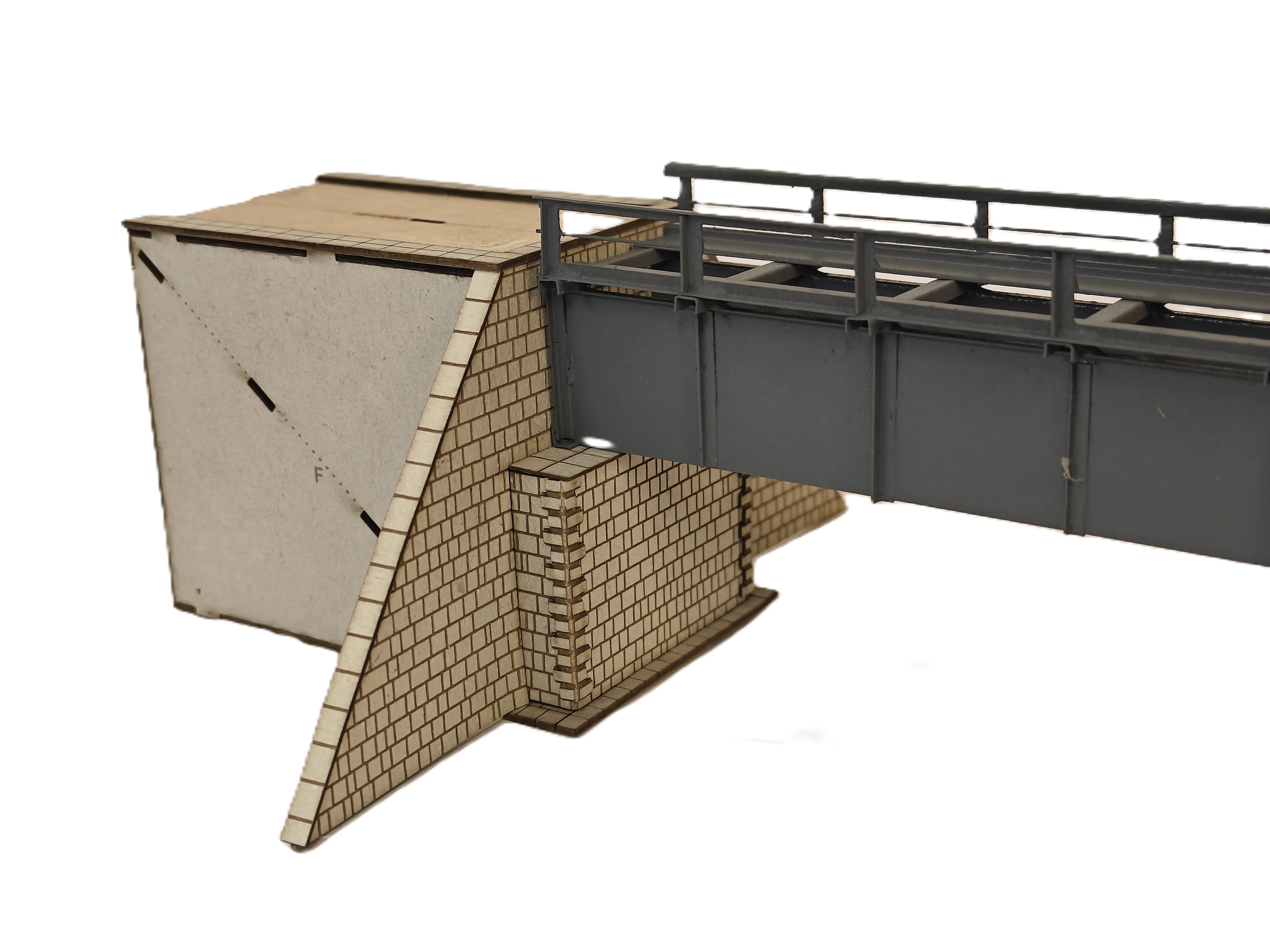 Die Brückenköpfe sind aus gravierter Graupappe und haben eine hölzerne Mittelstützwand und Deckplatte, um Schäden durch Feuchtigkeit (Leim) beim Schottern zu vermeiden. Der Bahndamm wird bei dieser Variante bis an die Flügelmauern geführt.