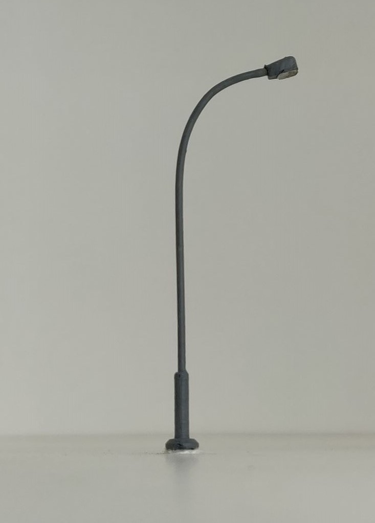 Fertigmodell im Maßstab 1:160 einer modernen, geschwungenen Strassenleuchte mit kleinem Lampenschirm.
