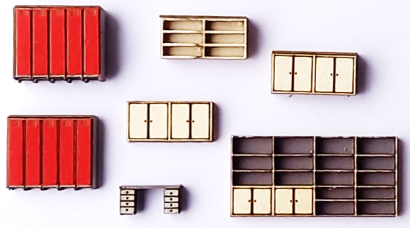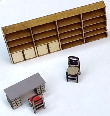 Bausatz zur Herstellung von Möbeln für einen Gewerbebetrieb. Modelle aus Pappe und Holz.