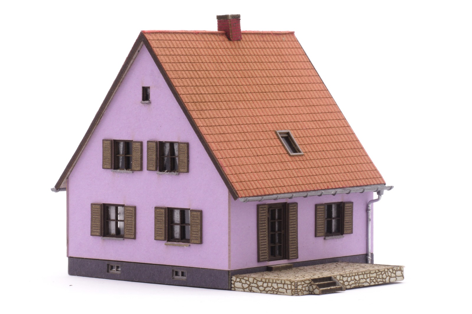 Das neue Gebäude ist maßstäblich in 1:160 nach einem Original aus dem Jahr 1950 entstanden. Es handelt sich um ein kleines Einfamilienhaus mit Hochkeller und ausgebautem Dachgeschoß, weiß verputzt und mit Terrasse.